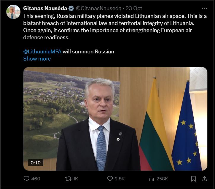 Il 23 ottobre, il Presidente lituano Gitana Nausėda ha comunicato una “palese violazione del diritto internazionale”: un caccia Su‑30 e un velivolo cisterna Il‑78 provenienti da Kaliningrad si sono inoltrati per meno di un chilometro nello spazio aereo lituano, dal quale, dopo circa 20 secondi, due Eurofighter dell’aeronautica spagnola li hanno scortati fuori.