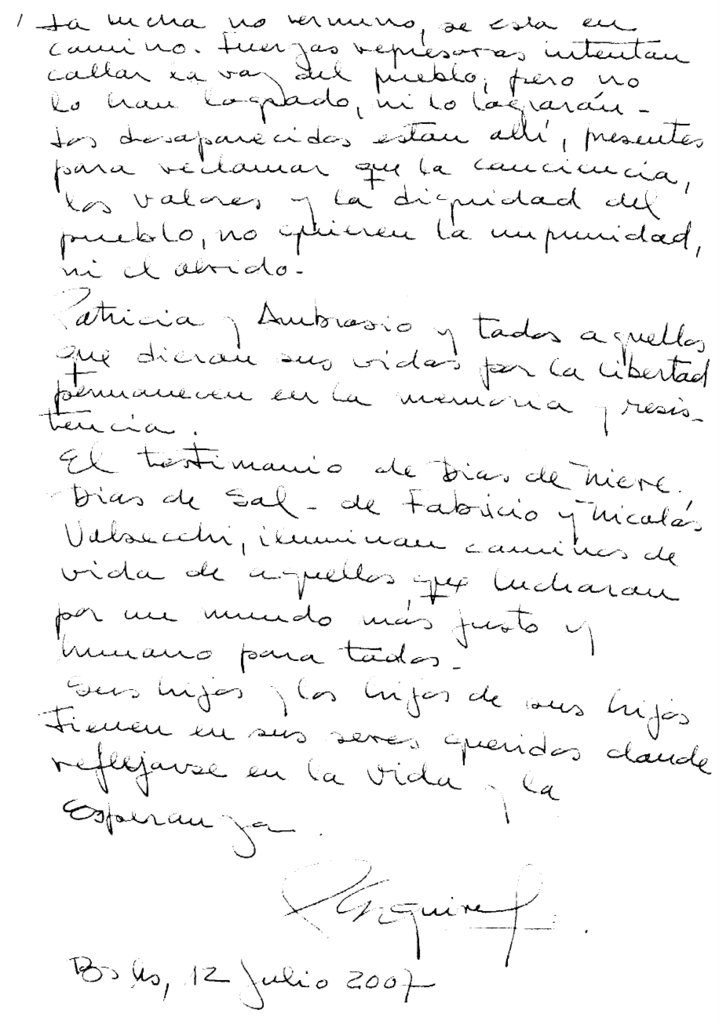 Questo bel libro è accompagnato dalla eccezionale prefazione del Premio Nobel per la Pace 1980, Adolfo Perez Esquivel. Pubblichiamo qui la versione olografa.