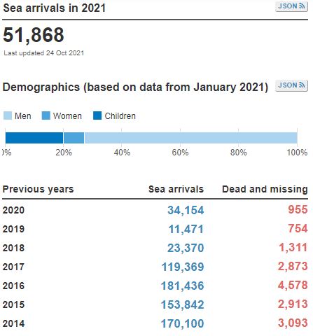 Questo ha a sua volta portato a una sproporzione: a fronte di un decimo di arrivi in meno rispetto al 2015, i morti nel 2020 sono stati poco meno della metà. Nel 2021 si stanno presentando proporzioni analoghe al 2020 o – in proiezione a fine anno – leggermente superiori. In pratica, oltre ad autorizzare de facto la brutalizzazione dei migranti nei Paesi di transito, le politiche europee sull’immigrazione hanno da un lato contribuito a ridurre (non fermare) i flussi e dall’altro reso le rotte molto più pericolose.