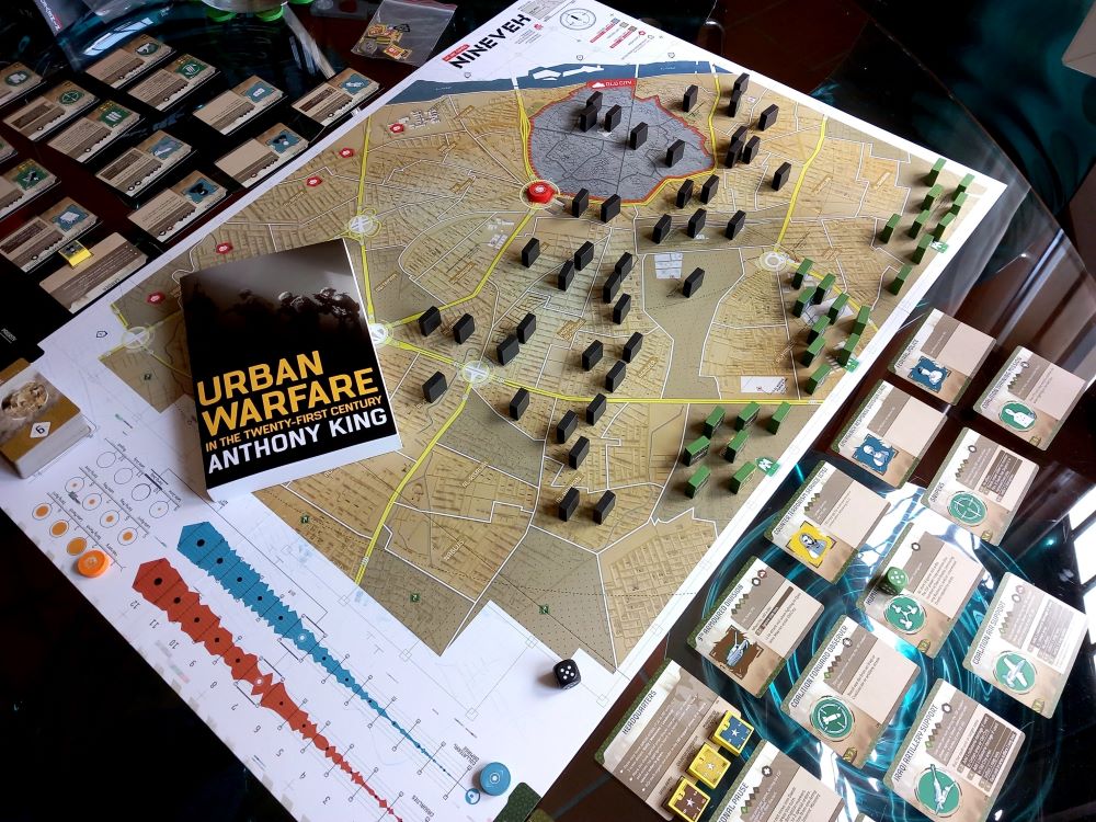Abbiamo utilizzato un terzo strumento per questo, impiegando il gioco da tavolo “We’re Coming Nineveh!” di Nuts! Publishing, che rappresenta le fasi finali della battaglia per Mosul contro l’ISIS nel 2017. Il wargame costringe i giocatori a scegliere una delle tre priorità sopra indicate, con la vittoria finale che dipende da come ogni lato si comporta rispetto alla propria priorità. Una particolarità è data dal fatto che il giocatore ISIS, essendo difensore, ha priorità opposte (può scegliere tra causare perdite alle forze della coalizione, costringere le forze della coalizione a causare danni collaterali eccessivi, o costringere la coalizione a vincere più tardi rispetto a quanto è avvenuto storicamente). I giocatori hanno un nucleo di forze di base e poi possono aggiungere altre truppe e risorse “acquistando” capability cards spendendo punti assegnati all’inizio (che rappresentano le risorse). Durante il gioco accadono eventi – che rappresentano elementi fuori dal controllo del giocatore – che aumentano la frizione.